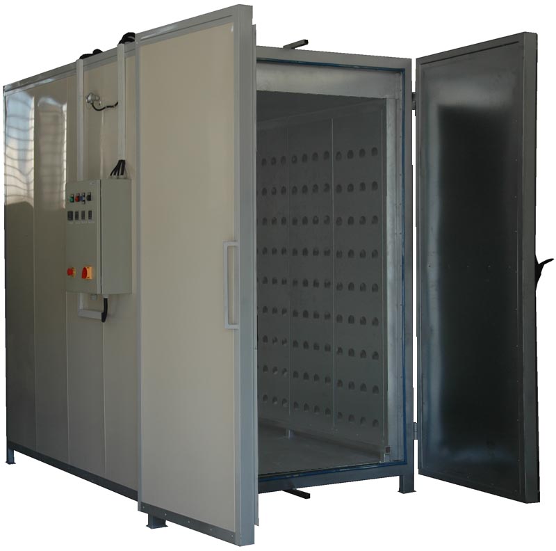 Чтобы исключить перепады температуры по вертикали, тупиковые печи должны оснащаться встроенными вентиляторами конвекторами. Другой разновидностью оборудования выступает проходная печь. Такой вариант является более современным, так как в нем используется автоматизированная линия. Такую печь можно совместить с существующей системой транспортировки, так как вход и выход находятся с различных сторон. Дополнительным преимуществом выступает воздушная завеса, которая устанавливается на обеих сторонах. Изделие доставляется на загрузочной тележке и перемещается внутрь печи, где проходит процесс окраски, после чего тележка выкатывается с готовым изделием. Среди минусов такой модели можно назвать только большой расход энергии в процессе работы.